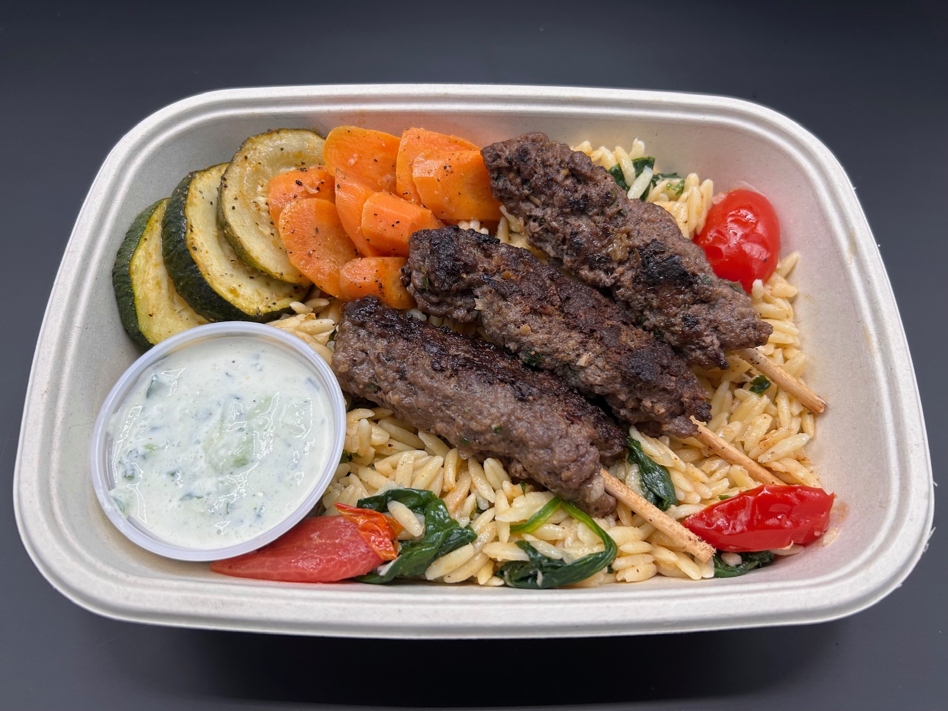 Savory grilled beef kofta, delicately seasoned with warm Mediterranean spices; Served atop a vibrant bed of zesty lemon orzo medley featuring tender zucchini, sweet peppers, and aromatic herbs. and roasted seasonal vegetables. Finished with a side of our creamy, house-made tzatziki for a cool, refreshing contrast.