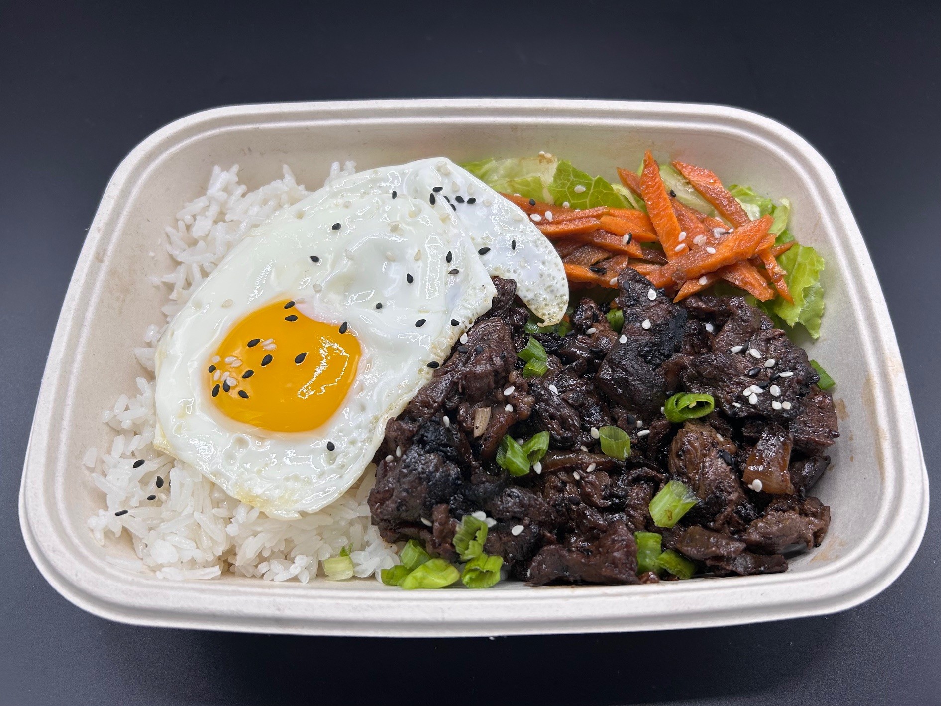 BEEF, JASMINE RICE, SEASONAL VEGETABLES, EGGS, ASIAN CARROTS (WATER, DISTILLED VINEGAR, CARROTS, SUGAR, GARLIC, GINGER), LIMES, ROMAINE, TOMATOES, OLIVE OIL, ARUGULA, OYSTER SAUCE, SOY SAUCE, BROWN SUGAR, BLACK PEPPER, RICE VINEGAR, BAKING SODA, CORNSTARCH