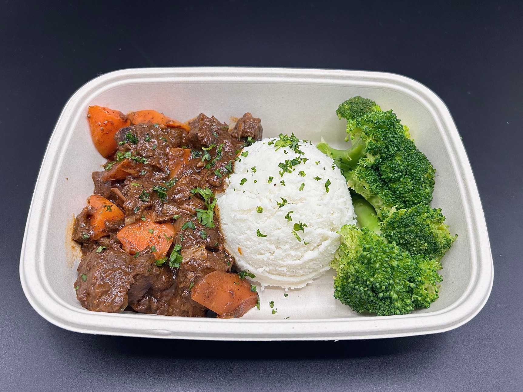 Experience the timeless flavors of slow-braised Beef Bourguignon, enriched with tender carrots and a deep, aromatic sauce. Paired with classic couscous infused with sautéed onions, fragrant garlic, olive oil, and fresh parsley, this dish is a perfect blend of hearty and refined. Topped with a sprinkle of freshly chopped parsley and the tangy bite of pickled red onions, it’s a modern twist on a beloved classic that delights with every bite.