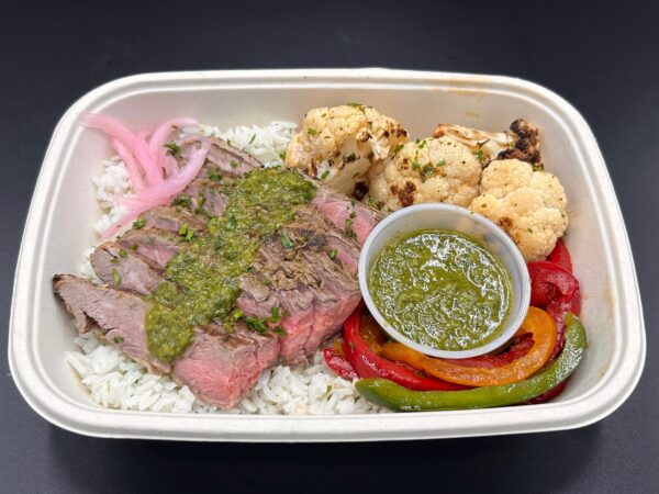Delight your senses with our vibrant Carne Asada Bowl, featuring tender, marinated steak grilled to perfection and served over a choice of fluffy cilantro-lime rice, delicious cilantro-lime quinoa or our flavorful low carb cauliflower rice. Accompanied by a colorful mix of roasted vegetables, this bowl is a feast for the eyes and the palate. Served with a side of chimichurri, every bite offers a harmonious blend of flavors and textures that will leave you craving more.