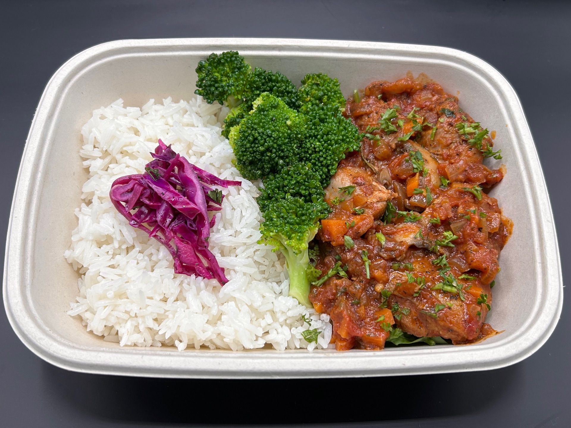 Tender, slow-braised chicken simmered in a rich tomato and red wine reduction, infused with fragrant garlic, sweet bell peppers, earthy mushrooms, and fresh herbs. Served over your choice of aromatic jasmine rice or a medley of fire-roasted seasonal vegetables for a hearty, soul-warming experience.