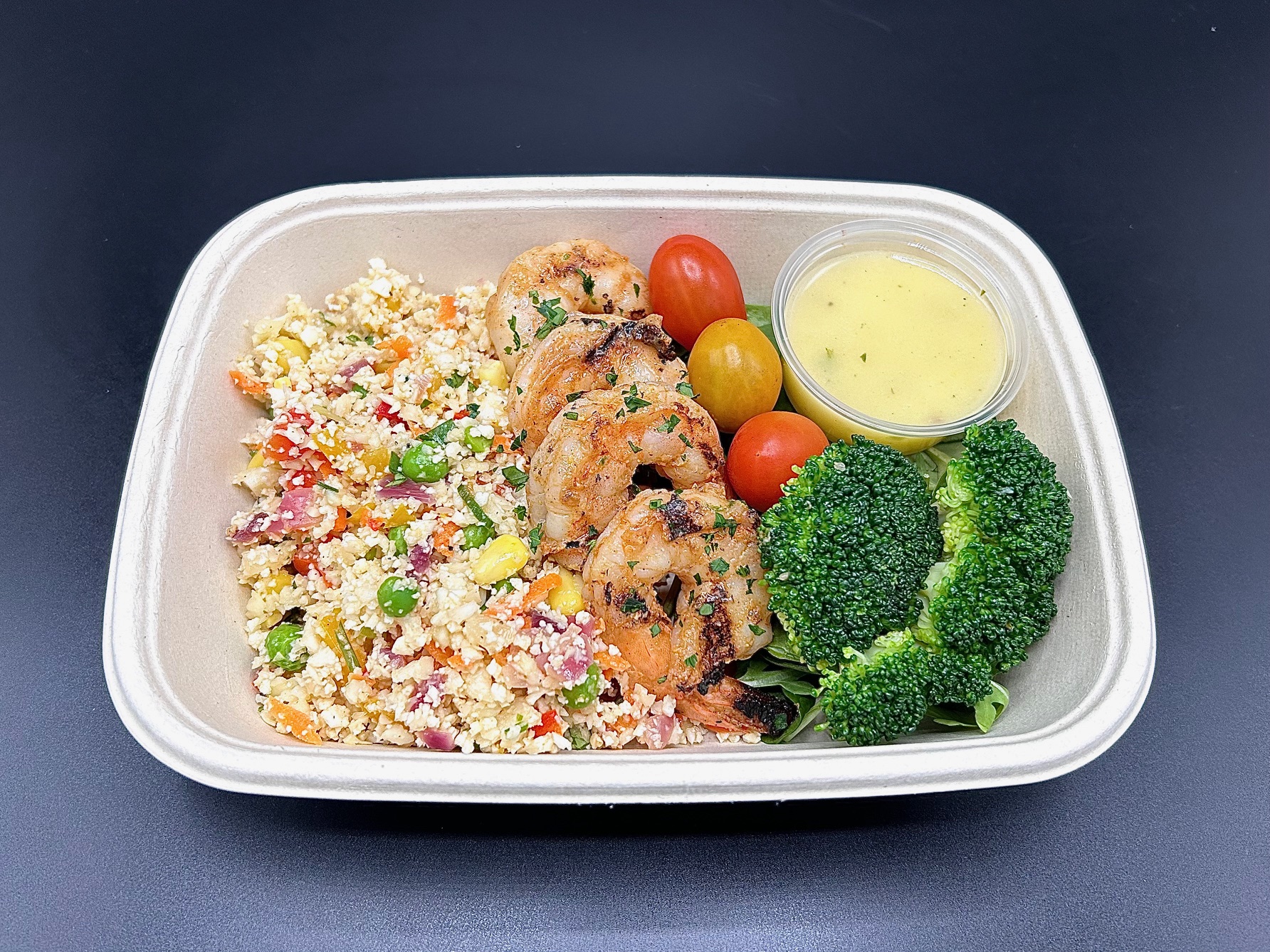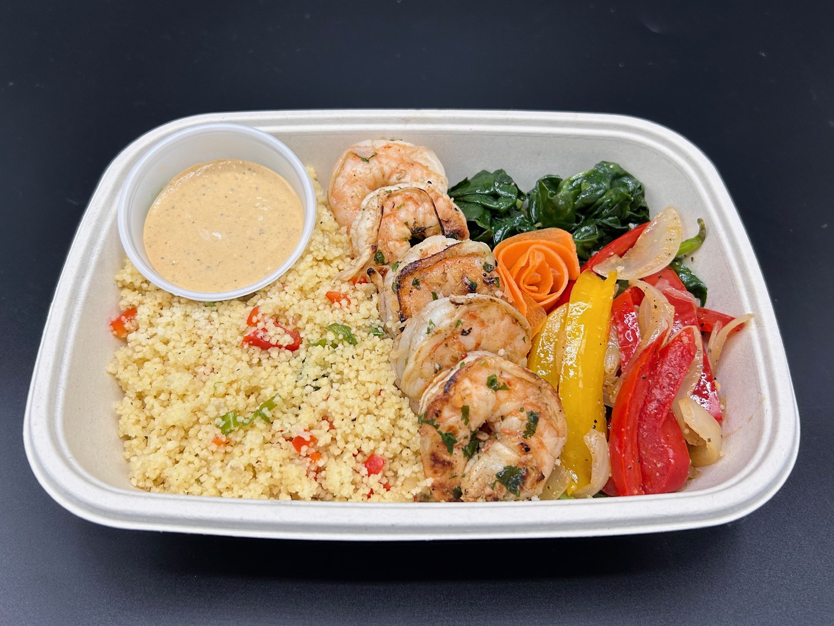 Delight in succulent shrimp infused with the vibrant zest of cilantro and lime, grilled to perfection for a burst of freshness. Nestled atop your choice of a fluffy couscous, or wholesome cauliflower rice medley, this dish features smoky roasted peppers and tender sautéed spinach for depth and flavor. Accented by delicate shaved carrots and finished with a lively garnish of chopped cilantro, a refreshing lime wedge, and a side of smoky chipotle sauce, every bite is a harmonious blend of bold and bright.