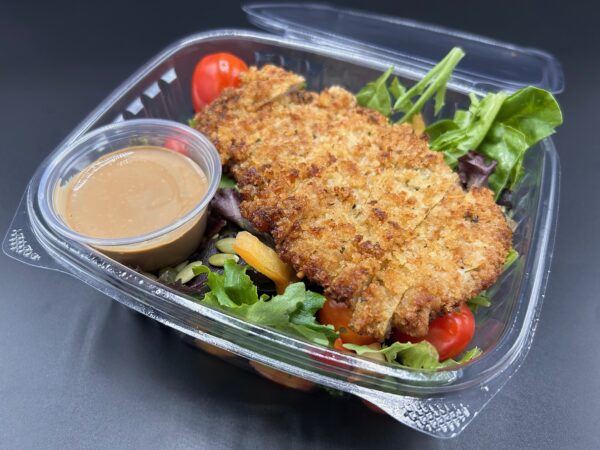 Golden hand-breaded chicken breast rest atop a vibrant blend of farm-fresh greens, heirloom grape tomatoes, crisp julienned peppers—all tossed with subtle pumpkin seed for a refreshing crunch. Served with a side of balsamic vinaigrette, artfully balanced to complement every bite without overpowering. A rustic yet refined celebration of texture and flavor.