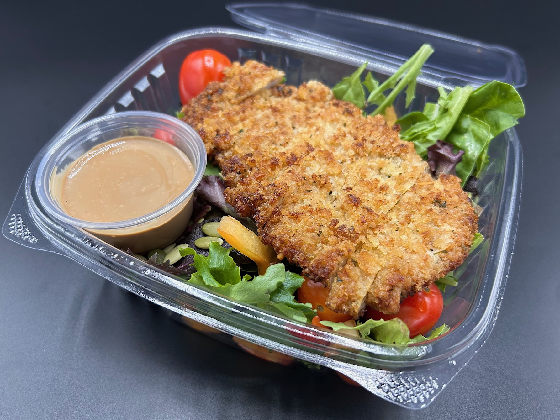 CHICKEN, SPRING MIX, CHERRY TOMATOES, PANKO CRUMBS, RED PEPPERS, AVOCADO OIL, CILANTRO, PUMPKIN SEEDS, KOSHER SALT, BLACK PEPPER, PAPRIKA, ONION POWDER