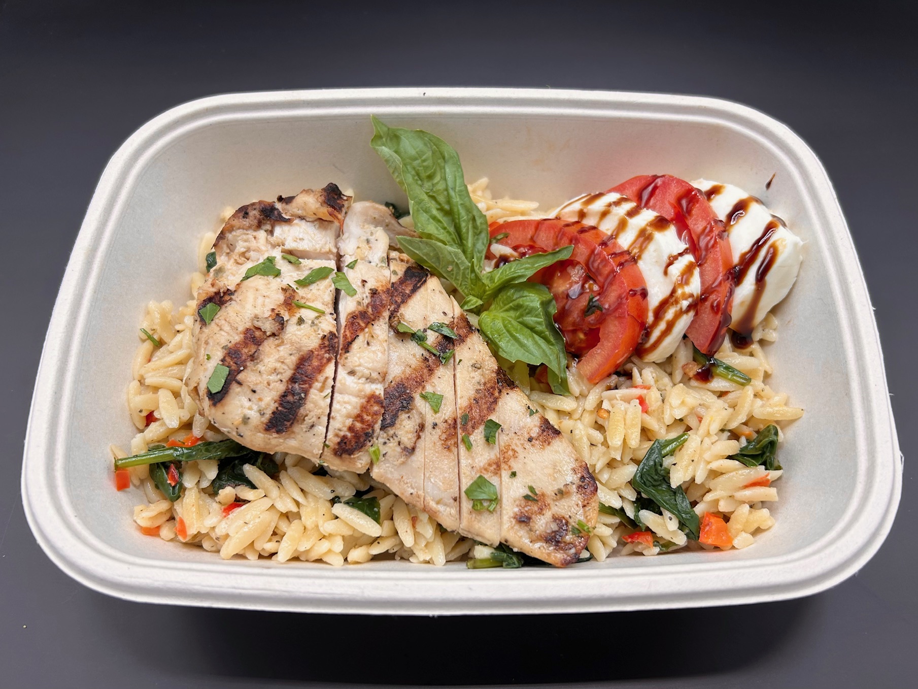 Tender grilled chicken breast with sun-ripened tomato, and mozzarella, served atop a bed of zesty lemon orzo—delicately tossed with extra virgin olive oil and citrus zest. Finished with a side of balsamic vinaigrette, this dish delivers a vibrant symphony of Mediterranean flavors in every bite.