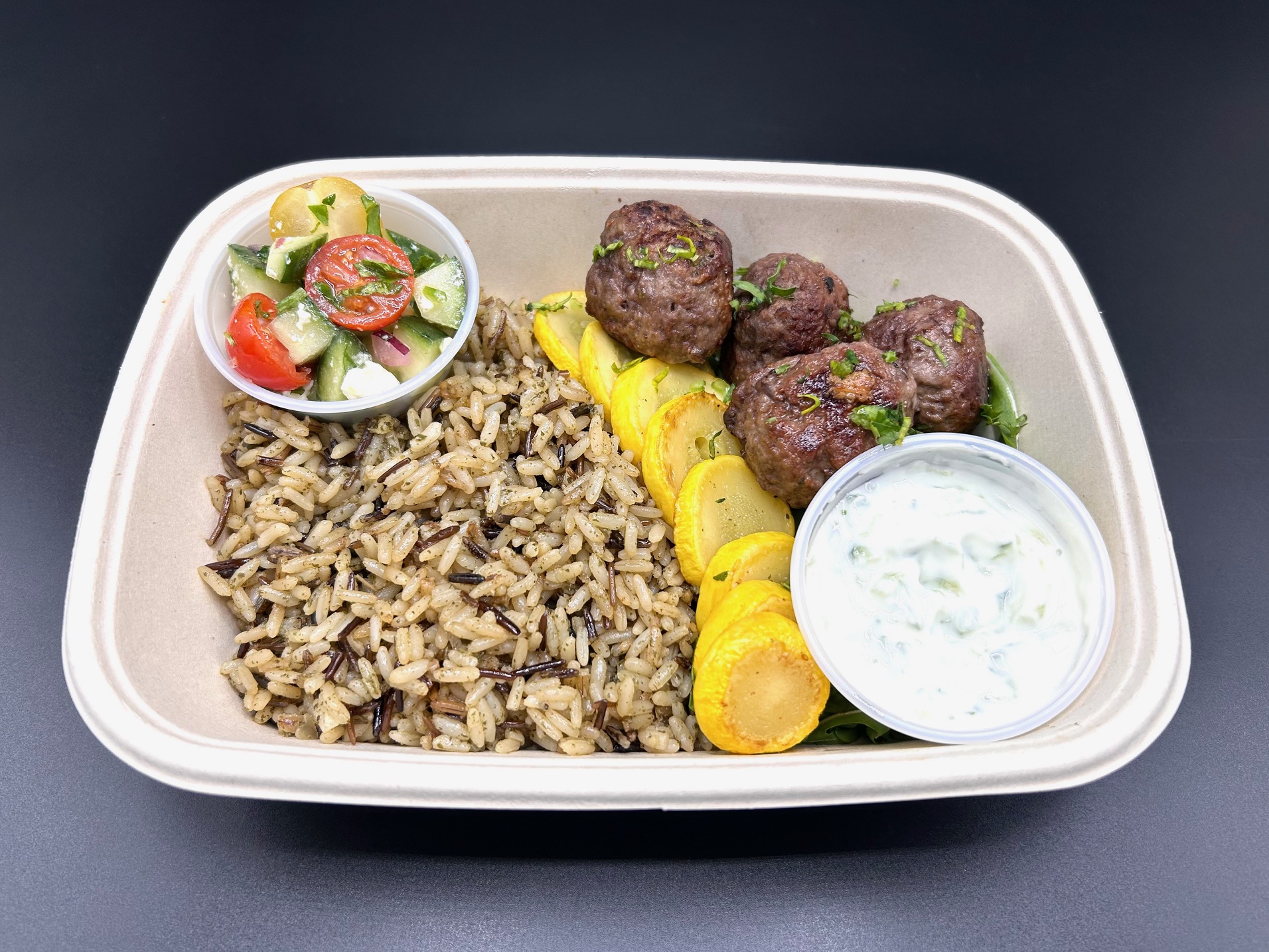 Juicy, herb-seasoned beef meatballs served over a hearty blend of wild and brown rice. Paired with roasted zucchini and a refreshing Israeli salad made with crisp cucumbers, tomatoes, and fresh herbs. Finished with a side of creamy tzatziki sauce for the perfect Mediterranean touch.