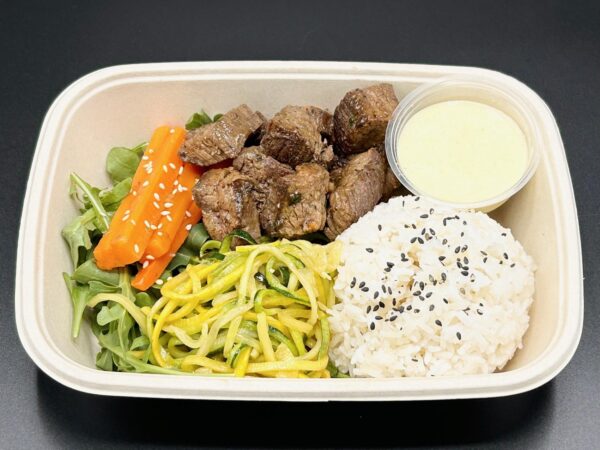 Experience the savory and umami-rich flavors of our Miso Steak Medley. Featuring tender, marinated steak chunks grilled to perfection and infused with a delicious miso glaze, this dish offers a perfect balance of sweet and savory notes. Served alongside a medley of fresh, zucchini noodles, carrot sticks and paired with steamed jasmine rice, or extra zucchini noodles; every bite is a harmonious blend of textures and tastes. Accompanied by miso dressing and garnished with a sprinkle of sesame seeds, this meal is a delightful fusion of Asian-inspired flavors that’s sure to satisfy.