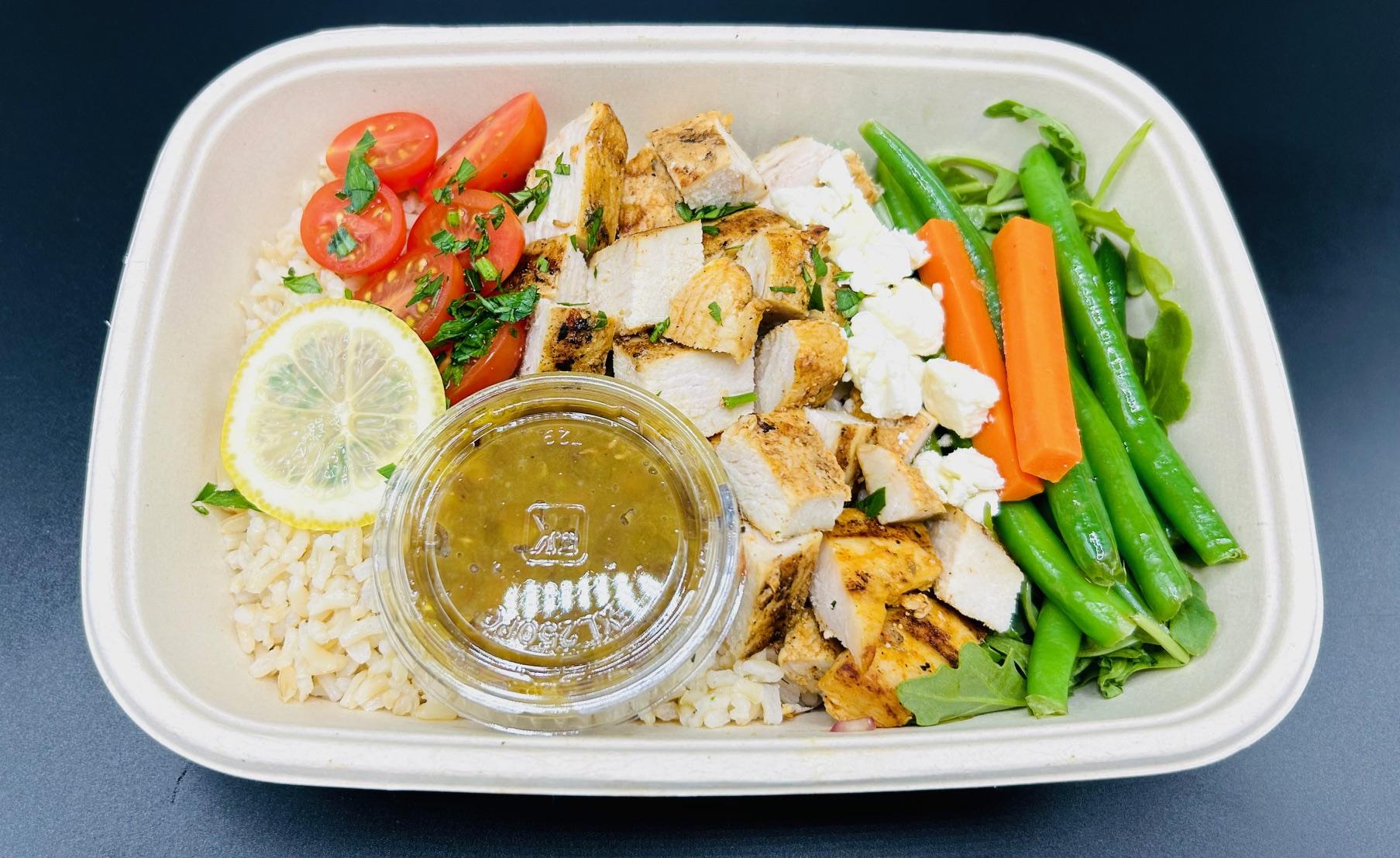 BROWN RICE, GRILLED CHICKEN BREAST, CHICKPEAS, TOMATOES, CUCUMBER, RED PEPPERS, LEMON JUICE, CABBAGE, ARUGULA, PARSLEY