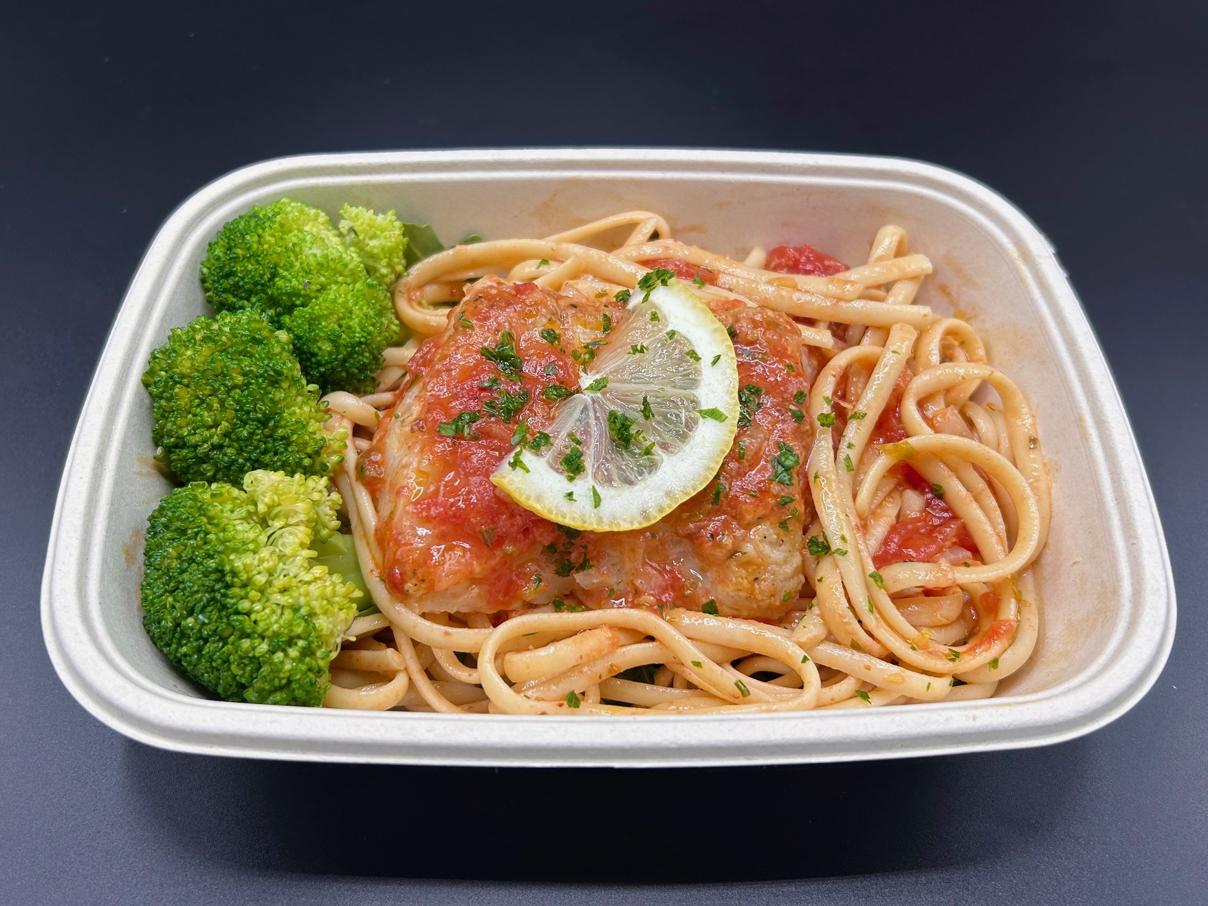 LINGUINE, TOMATOES, PACIFIC COD, ROASTED SEASONAL VEGETABLES, WHITE WINE, OLIVE OIL, CHERRY TOMATOES, ORGANIC LEMON, GARLIC, BASIL, SUGAR, LEMON PEEL, PARSLEY, SALT, BLACK PEPPER, CAYENNE PEPPER