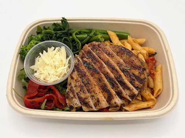 Savor the rich and creamy flavors of our Penne Vodka with Grilled Chicken. Featuring penne pasta coated in a luscious tomato vodka sauce, this dish offers a perfect balance of savory and tangy notes. Tender, grilled chicken breast adds a delightful layer of flavor and protein, while the seasonal vegetables bring freshness to the dish. Garnished with freshly grated Parmesan cheese, every bite is a comforting and indulgent experience that will transport you to the heart of Italy.
