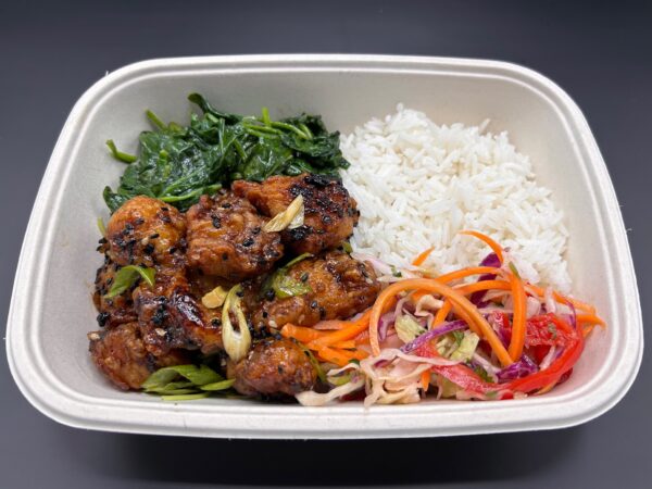 Inspired by Korea’s vibrant culinary scenes, this comforting bowl showcases crispy golden chicken glazed with a subtle gochujang-maple blend—more sweet than spicy. Resting on a choice of jasmine rice or quinoa, accompanied by seasonal vegetables, and topped with toasted sesame seeds. This bowl is a flavorful escape that’s bold without the burn.