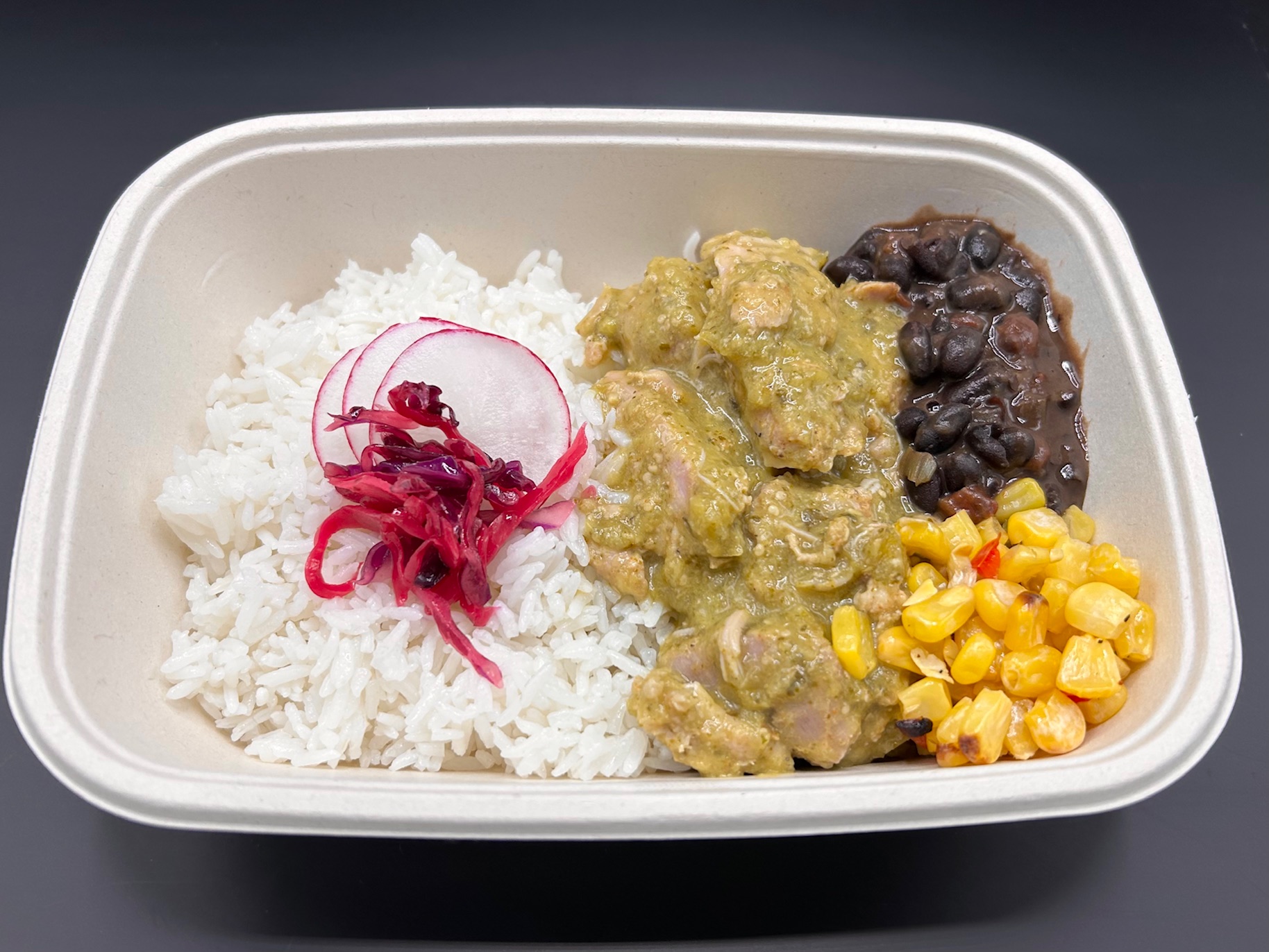Delight in the fresh and zesty flavors of our Verdant Tomatillo Chicken Bowl. Featuring tender chicken slow cooked in a vibrant tomatillo salsa, this dish offers a delightful balance of tangy and savory notes. Served over a choice of fluffy jasmine rice, cauliflower puree, or roasted potatoes, accompanied by corn, and black beans. Garnished with radish slices and a side of tomatillo sauce. Every bite is a refreshing and satisfying journey through vibrant, verdant flavors.